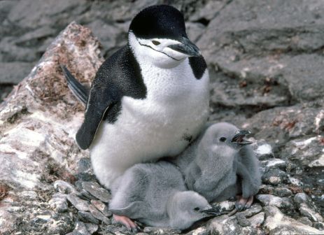 Pinguinii Chinstrap se pot distinge prin dunga neagra de pe fata, parand ca poarta o cascheta prinsa sub barbie. Picioarele sunt portocalii si spatele este negru, la fel ca ochii. Masoara 68 cm si cantaresc 4,5 kg. Numara in jur de 5 milioane de perechi. Traiesc in zonele sub-antarctice, insulele Antarctice si Peninsula Antarctica.