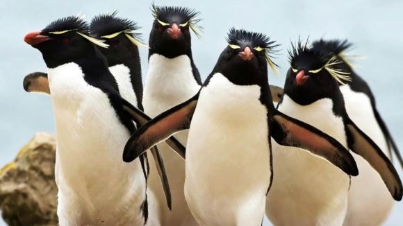 Pinguinii rockhopper sunt pinguini cu creasta. Penele colorate in toate directiile amintesc de generatia punk rock. Spatele si picioarele sunt portocalii, iar ochii sunt de culoare rosie. Sunt cei mai mici pinguini, ajungand doar la 55 cm inaltime. Se intalnesc in jurul Antarcticii, in insulele din Falkland, insulele sub-antarctice de nord .